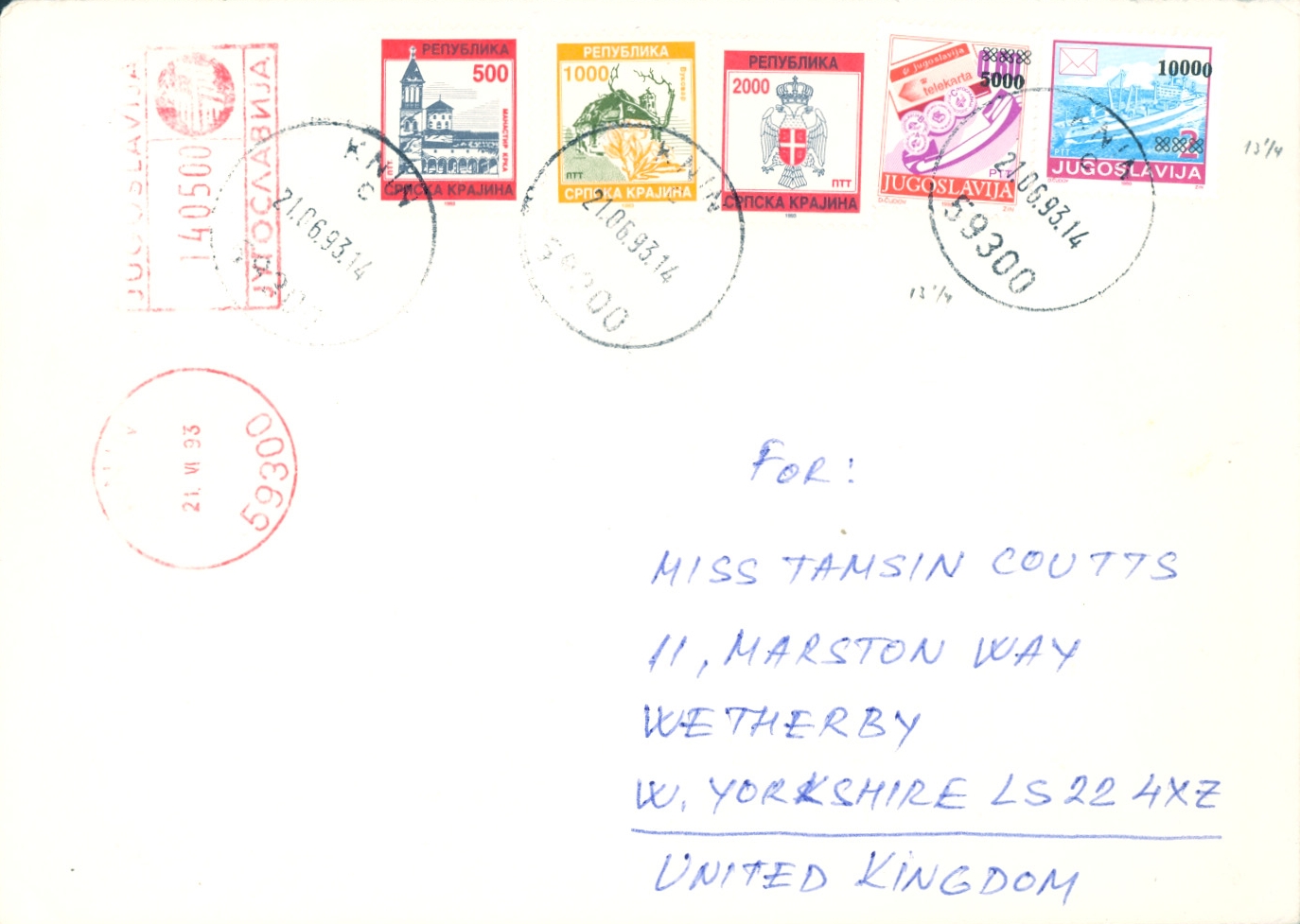 (klikni na sliku za povećanje) Celo pismo (privatno) upućeno iz KNIN-a za Englesku 21.06.93. sa najređom redovnom markom kninskog privremenog izdanja kat.br. 9A Tip Ia) ispravno putovalo
