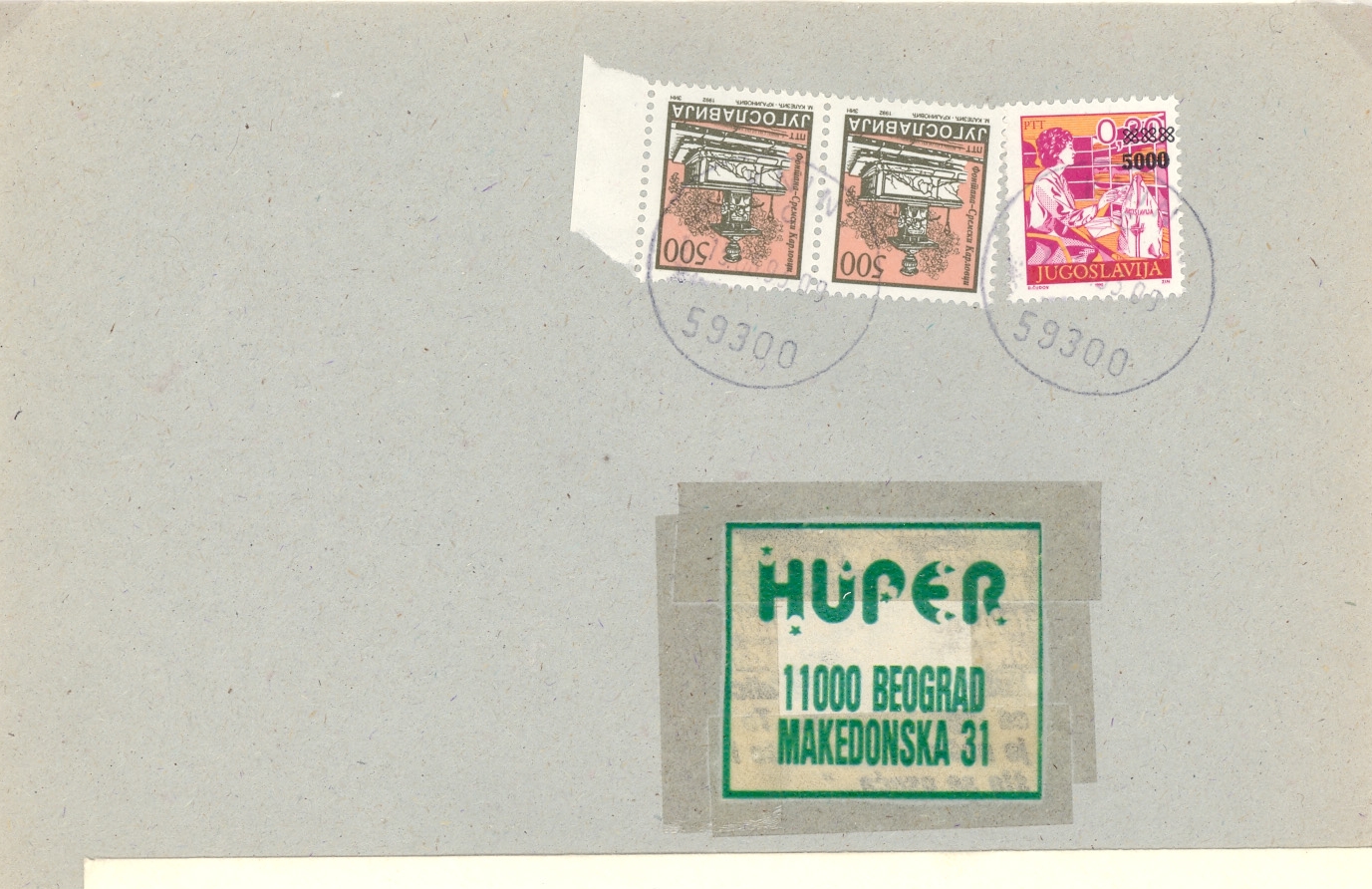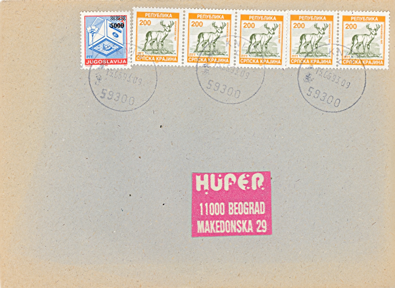 (klikni na sliku za povećanje) Falsifikovani poštanski žig KNIN 59300 u privatnom vlasništvu – primer HUPER pisma, mešana frankatura
