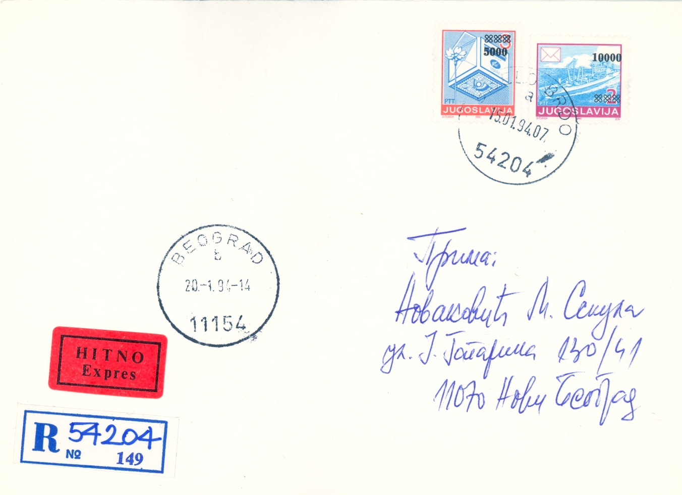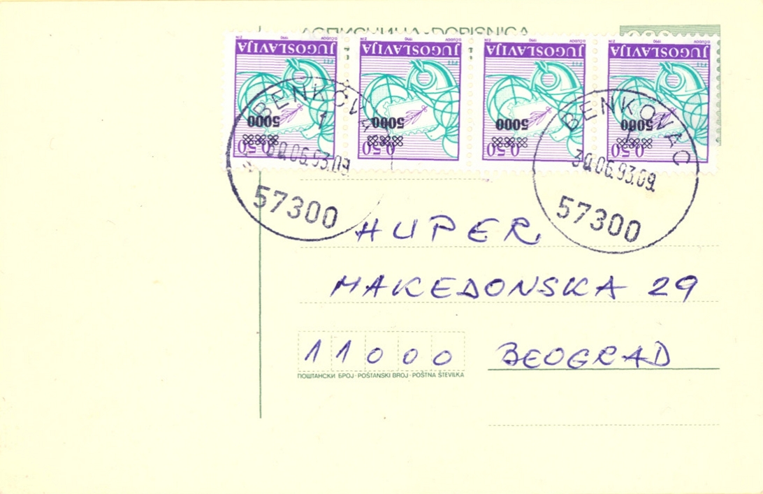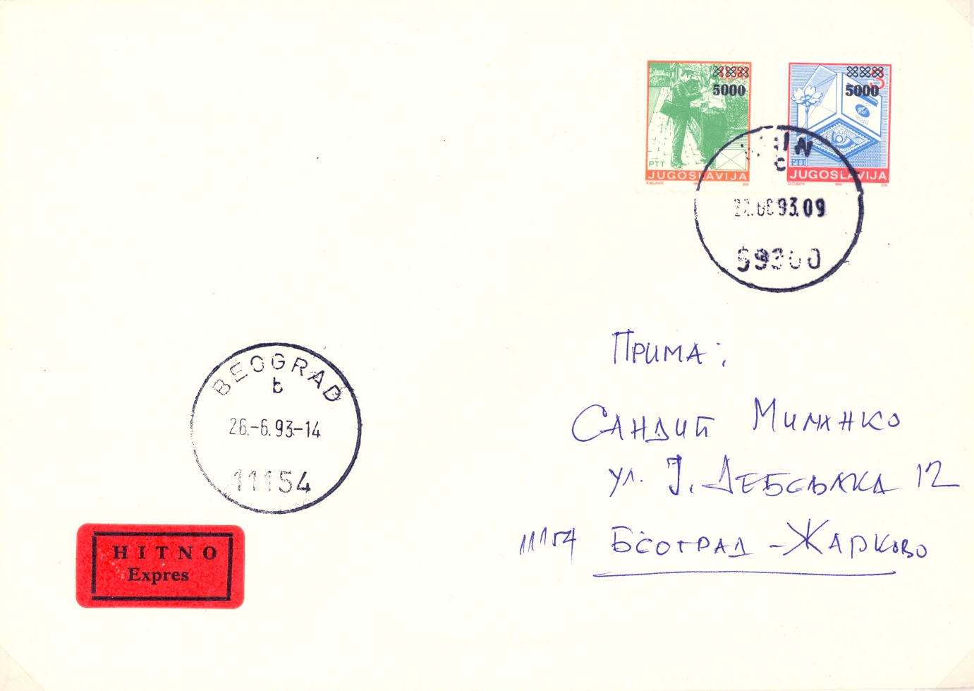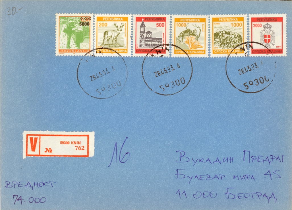 (klikni na sliku za povećanje) Lažni poštanski žig KNIN – primer privatno pismo sa lažnim žigom 22.06.93.09. i zloupotrebljenim žigom Beograd (b) 11154