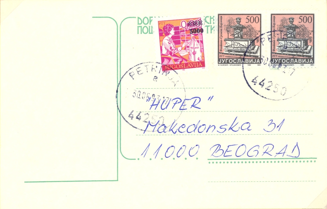(klikni na sliku za povećanje) Dopisnica poslata iz Petrinje za Beograd sa mešanom frankaturom Kninskog privremenog izdanja i redovnih maraka Jugoslavije. (Jedina poznata originalna dopisnica)