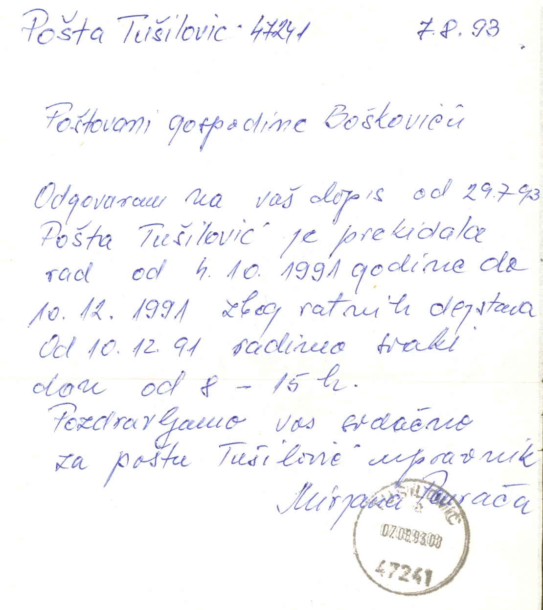 OPIS DOKUMENTA Kada sam krajem 1993.g. radio na prvom "Katalogu poštanskih maraka Republike Srpske i Republike Srpske Krajine" u prepisci sa poštanskim službenicima Krajine uočio sam jedno zanimljivo celo pismo i njegov sadržaj. Na tankom listu polovljenog A/4 formata piše: Odgovaram na vaš dopis od 29.07.1993.g. Pošta Tušilović je prekidala rad od 04.10.1991.g. do 10.12.1991.g. zbog ratnih dejstava. Od 10.12.1991.g. radi svaki dan od 8-15 sati. Potpis upravnika Mirjana (prezime nečitko). Šalterski poštanski žig pošte Tušilović (a) 47241 od 07.08.93.08. Pošta je u srpskoj Krajini radila sve do avgusta 1995.g., kao uostalom i ostale pošte zapadnog dela.