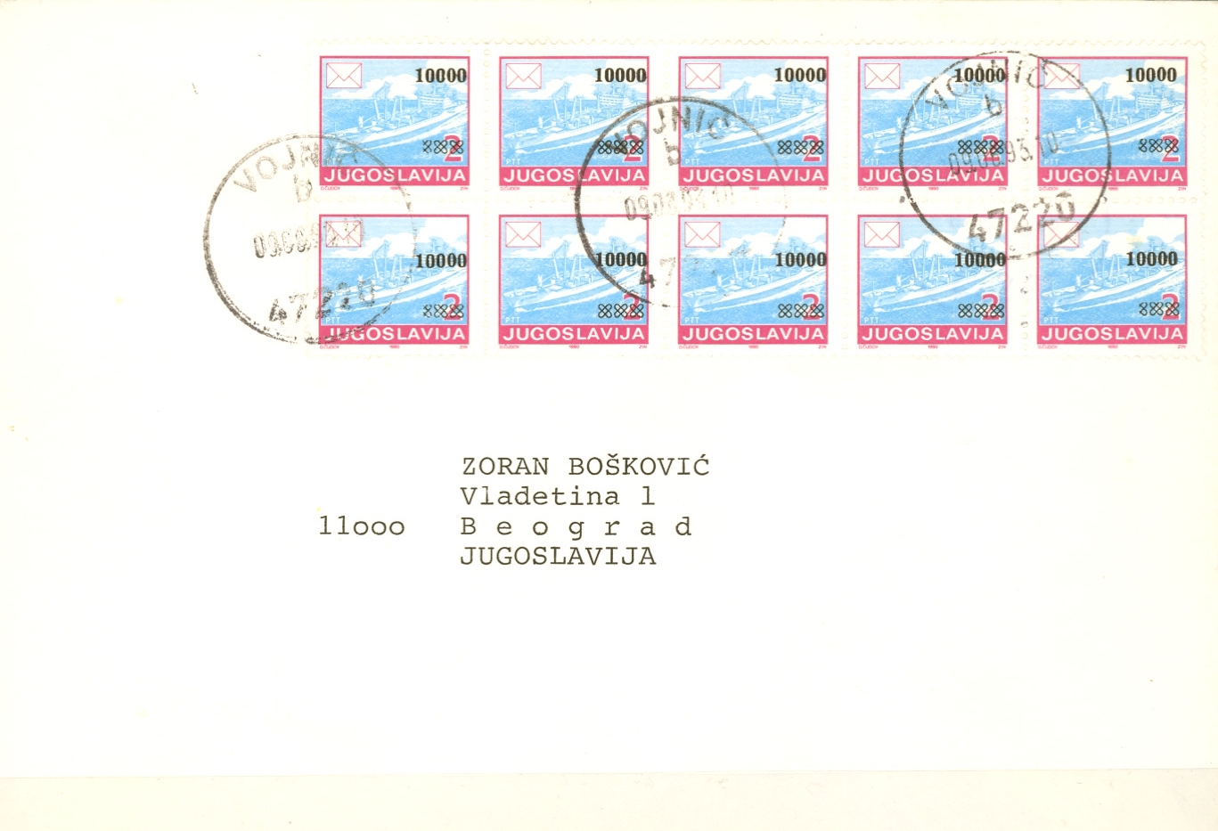 OPIS KOVERTA Koverat, formata malo većeg od standardnog sa unapred popunjenom adresom. U gornjem delu koverta deseterac redovnih poštanskih maraka (Krajine) i tri poštanska žiga pošte Vojnić (b) 47220 i datum 09.08.93.10. Postavlja se pitanje zašto nije poštanski žig pošte Tušilović? Svoju radoznalost brzo sam zadovoljio time što sam uočio ispod nalepljenih maraka poštanski žig pošte Tušilović. Kao mala pošta nedaleko od Vojnića u pravcu Karlovca, pošto nije imala u tom periodu poštanske marke, dostavljala je svoju poštu većoj pošti Vojnić. Na pošti Vojnić nalepili su "odgovarajući" iznos za obično pismo prve stope težine u iznosu od 100.000 dinara.